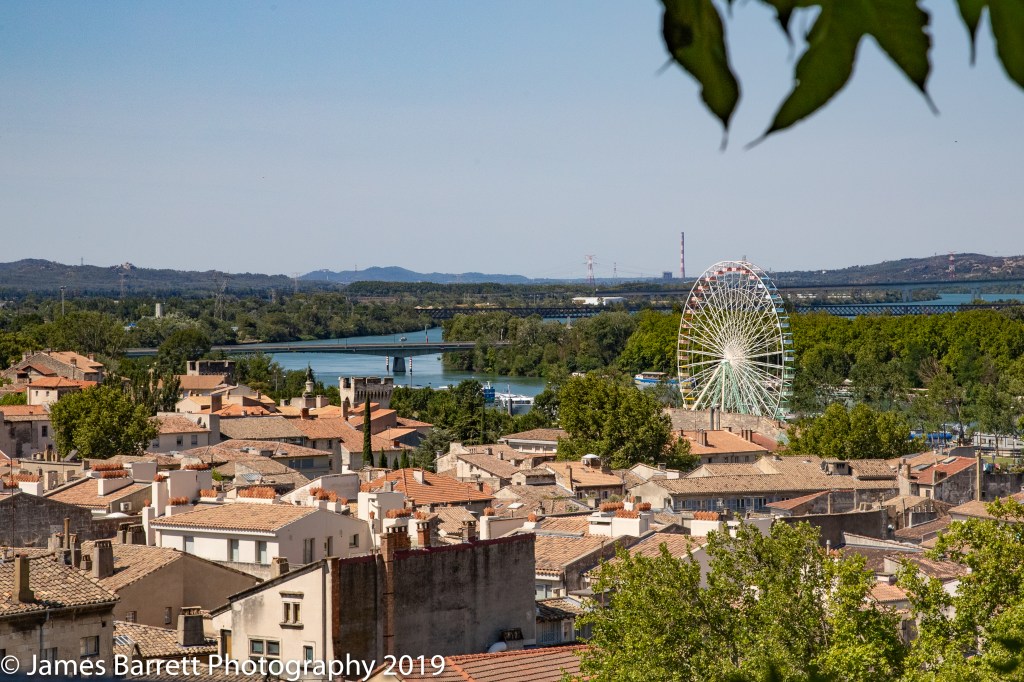 View of Rhône and Avignon from palace gardens. Emerald to left of Ferris Wheel