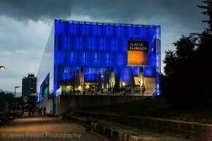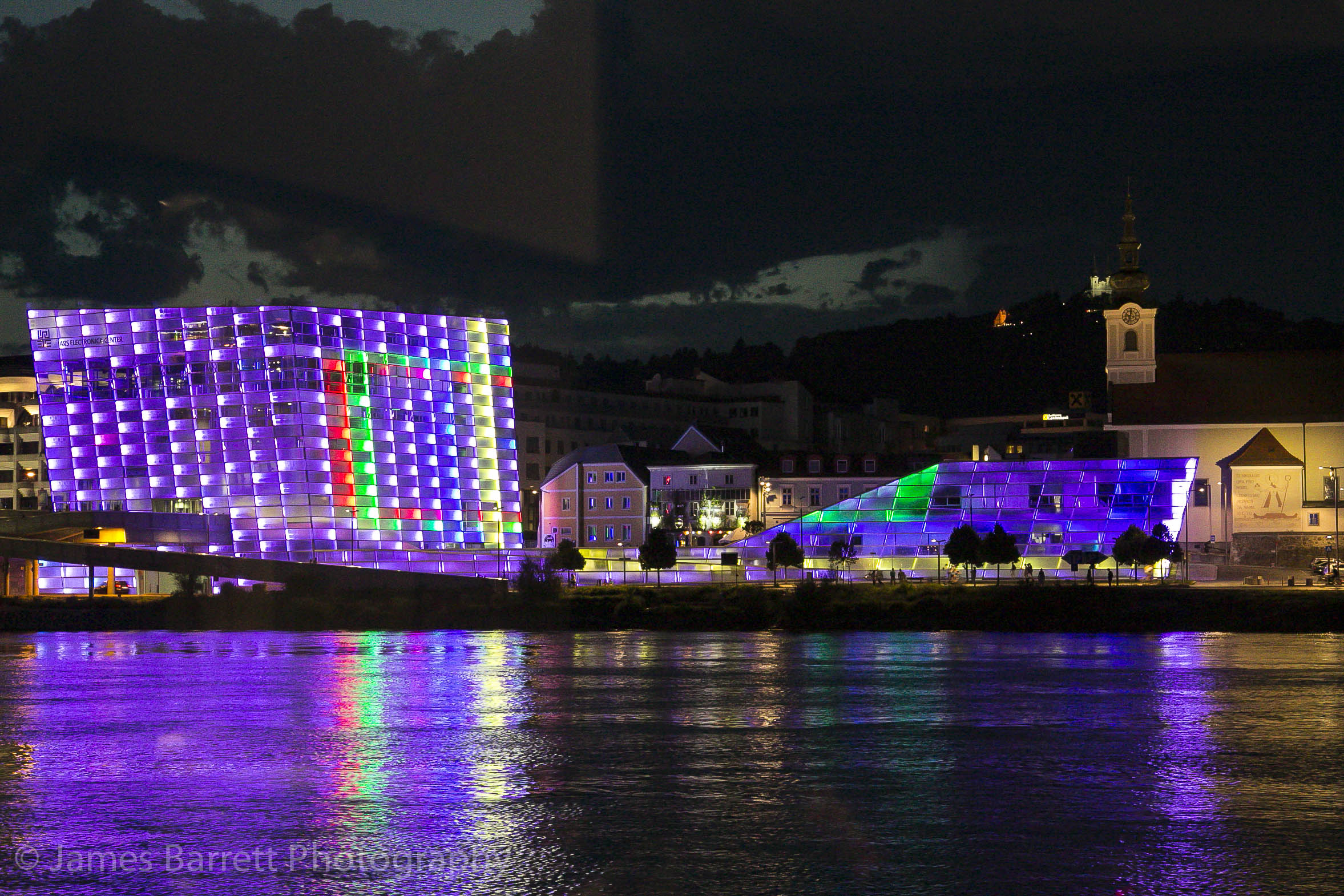 Lentos Art Museum lighted buildings across the Danube.
